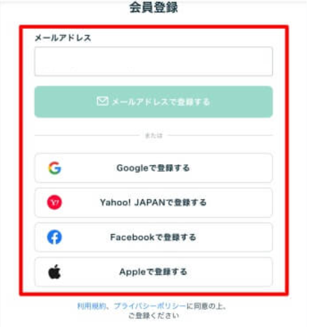 というのもステップ数を最小限にするためメールアドレスやGoogle、ヤフーIDやFacebookアカウントを使えるようになっています。