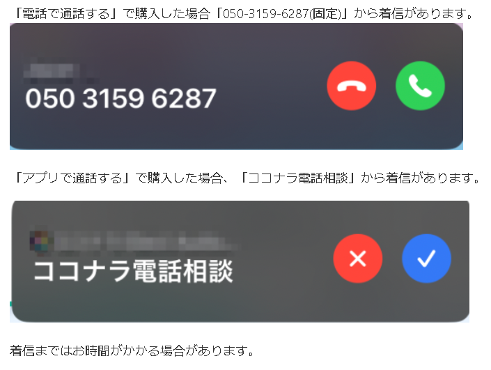 あなたがアプリ通話で発信しても、相手には「ココナラ電話相談」からの着信として表示されます。
